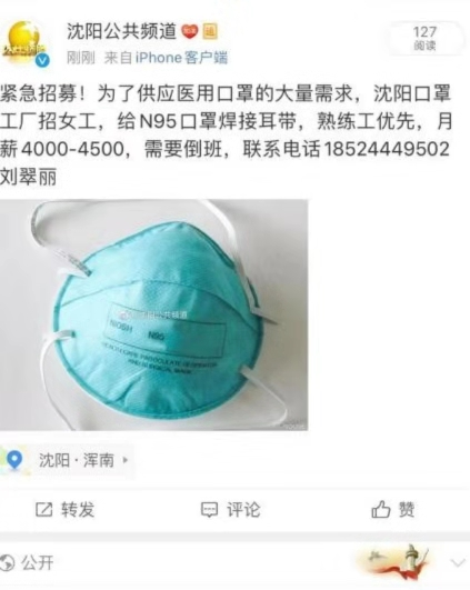 2月3日,市工信局得知重点防疫物资生产企业存在招募专业人员困难的问题,立即协调沈阳电视台为企业发布招聘信息,在沈阳电视台公共频道官方微博和今日头条发布了招聘信息,为企业招工用人提供便利条件,实现防疫物资器材生产保障。